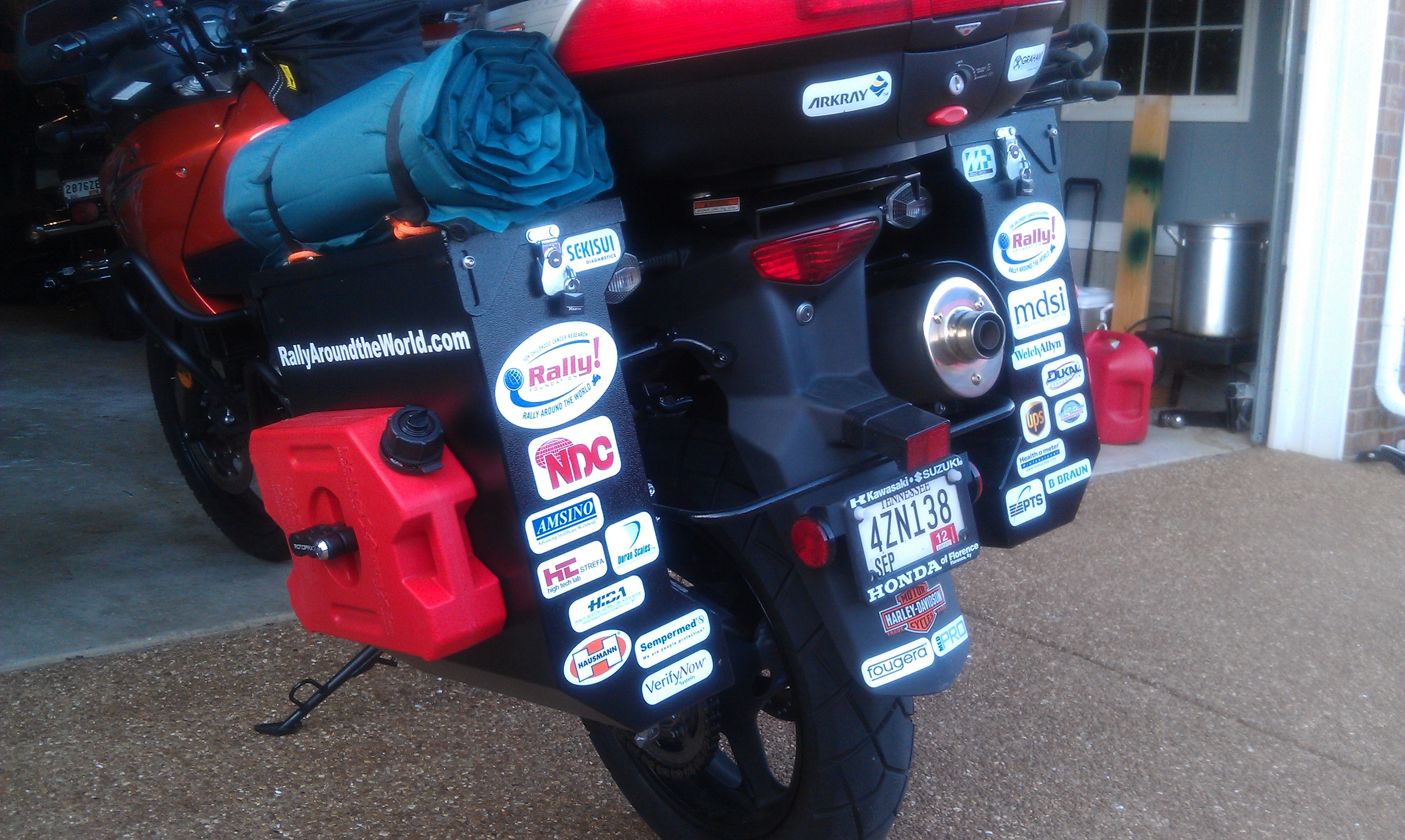 Down to just 3 days before I head out on this 14,000 mile ride around the world supporting Rally Foundation and all the great things they do to fight childhood cancer. The rally begins Friday evening, July 27 with a kick-off party at Cool Springs Powersports in Franklin from 7pm to 9:30pm with food, drinks, music and a good time. On Saturday morning, July 28 the Rally Around the World First-leg Ride starts with registration from 9am – 10:30am at Cool Springs Powersports and the ride leaving for Mid-South Motoplex in Clarksville – about a 60 mile ride. From there I’ll head out for my first stop in St. Louis staying with Paul & Lilly Telker with T-Plex Industries – an NDC vendor partner that has been so gracious in allowing me to stay the night in their home!